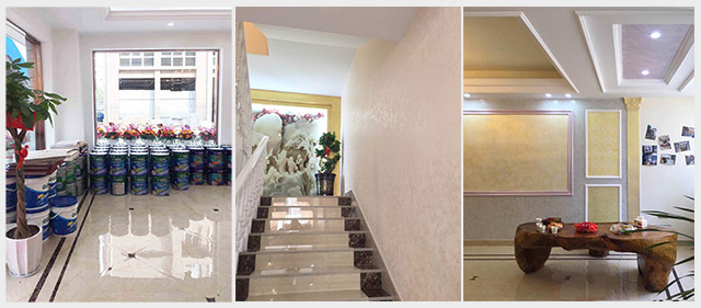 箭牌墙艺浙江松阳加盟店品味极致、内外兼修。店面招牌、外立墙面均采用性能优异的液态花岗岩涂料(花彩漆),真石效果、质感强烈、栩栩如生,高端大气上档次!店内墙面选用箭牌多个系列生态质感艺术涂料产品,如绸似缎、经典豪华,成为展示各种不同墙艺产品施工效果的最佳场所,让消费者随时随地体验箭牌艺术涂料与众不同的装修风格。而店内天花吊顶的艺术涂料展示效果更加出色,幻变视觉、绵延如真,就算在普通的照明灯光下也能让人眼前一亮,无需华丽灯饰,也足以独当一面!整个店面大堂在各种艺术涂料的相互映衬下显得端庄优雅,华丽大气!